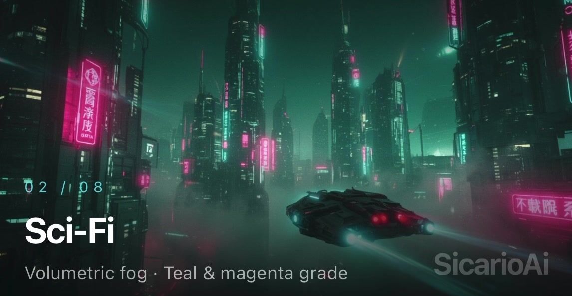 SicarioAi SHOWREEL example… You are looking at Full-bleed dark section, stage: 16:9 frame, max-w-6xl, rounded-2xl, soft cyan glow, 8 SicarioAi layered images with opacity crossfade (4’s hold, 1.5’s fade — to be exact cause I THINK in numbers, so I engineered SicarioAi to process like me..), active image gets slow scale(1.0 → 1.08) that would be Ken Burns over 5.5’s, with caption overlay (bottom-left): 01 / NEO-NOIR — "Rain-soaked alley, anamorphic 2.39:1,” of course in case you’re a production “noob,” progress dots (8) will be integrated by me on site landing page below the frame, current one will be filled cyan and there will be pause on hover, resume on leave, reduced-motion near end…